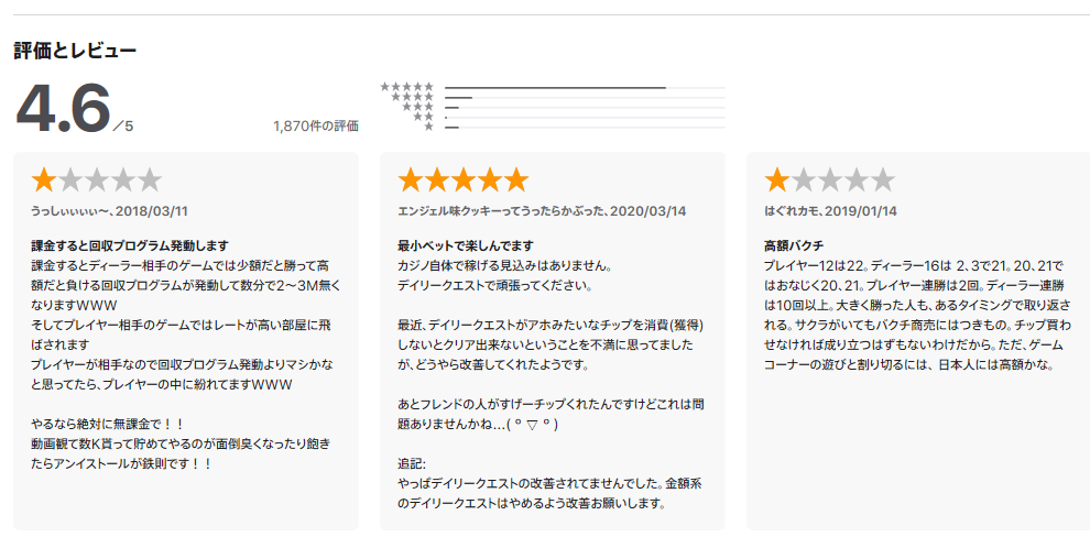 カジノアプリあるあるなのですが、課金したとたん負けまくるという趣旨のレビューが多いです。。。笑