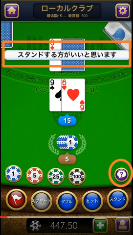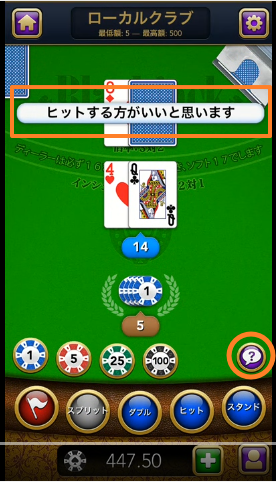 ベーシックストラテジーにのっとて、どう賭ければより高い確率で勝てるかを教えてくれる機能があります。