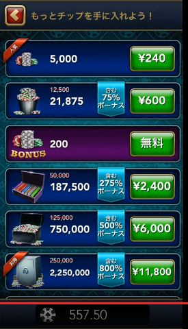 初期チップが500ドルと少ないため、やり込もうと思うと課金が必要です。