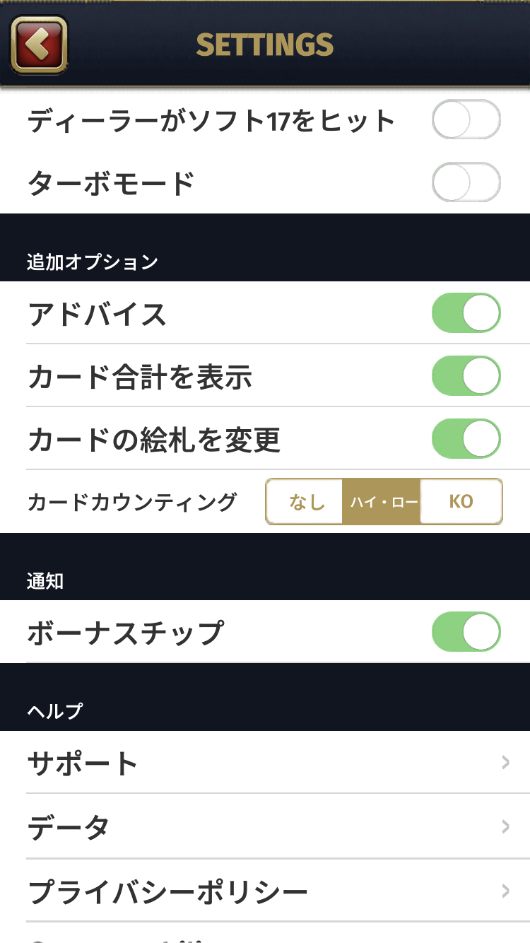 設定画面で、カードカウンティング補助機能を有りにすることで、カードカウンティングを体験できます。