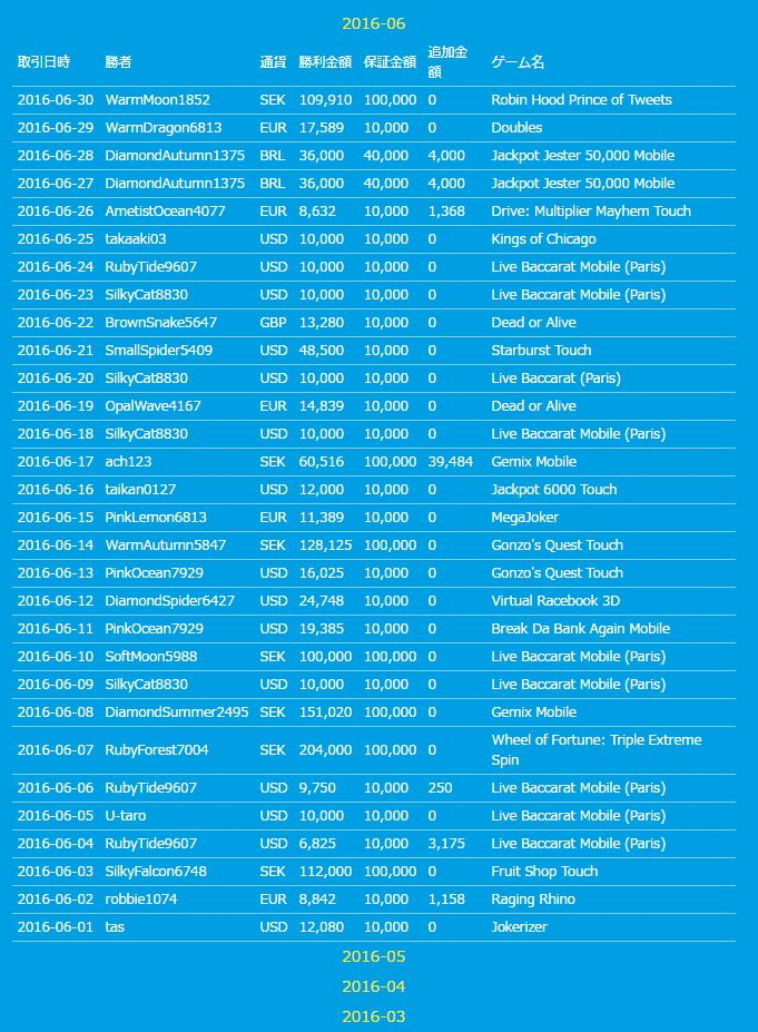 2016年6月の必勝勝利金獲得者一覧